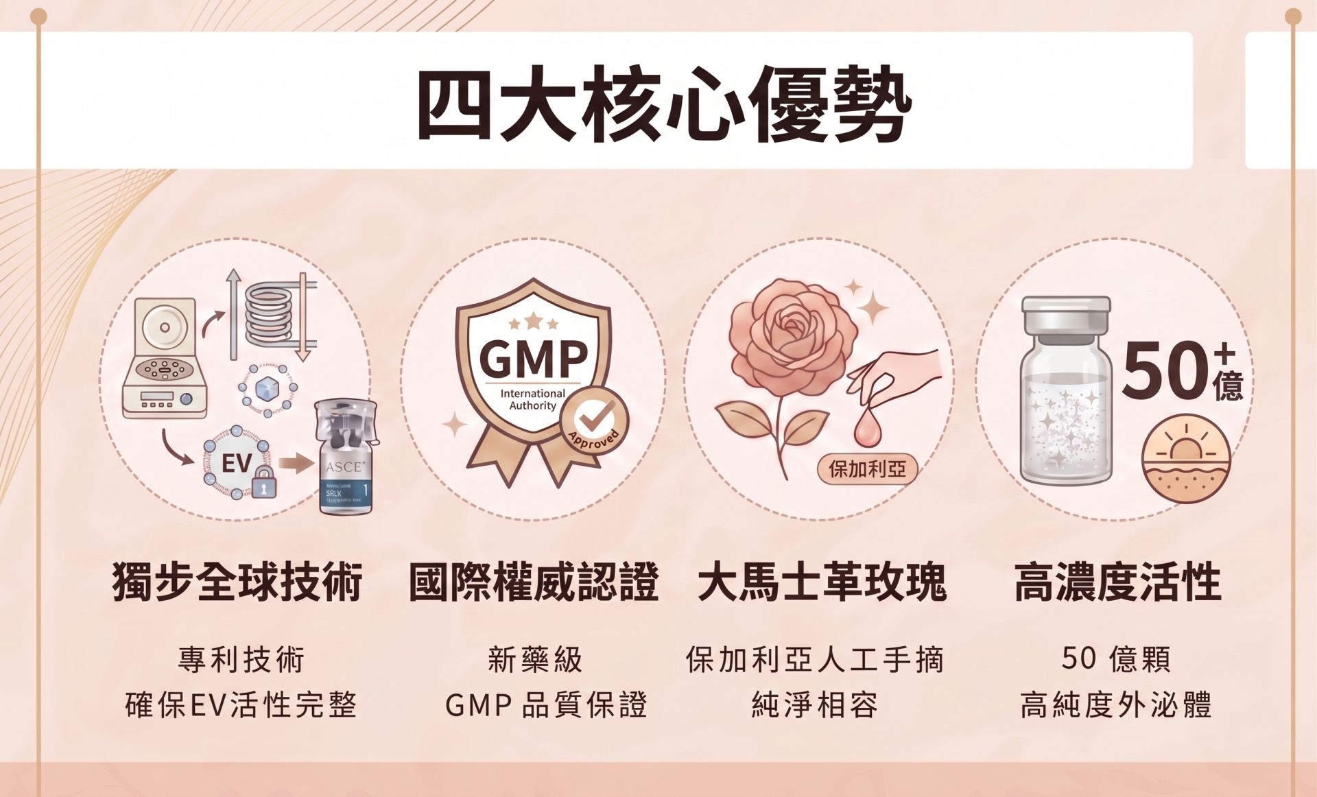 原廠合法產品現場拆封: 全面使用原廠且具衛福部認證之藥品,提供現場核銷與拆封確認,確保大馬士革玫瑰 EV 活性完整 。